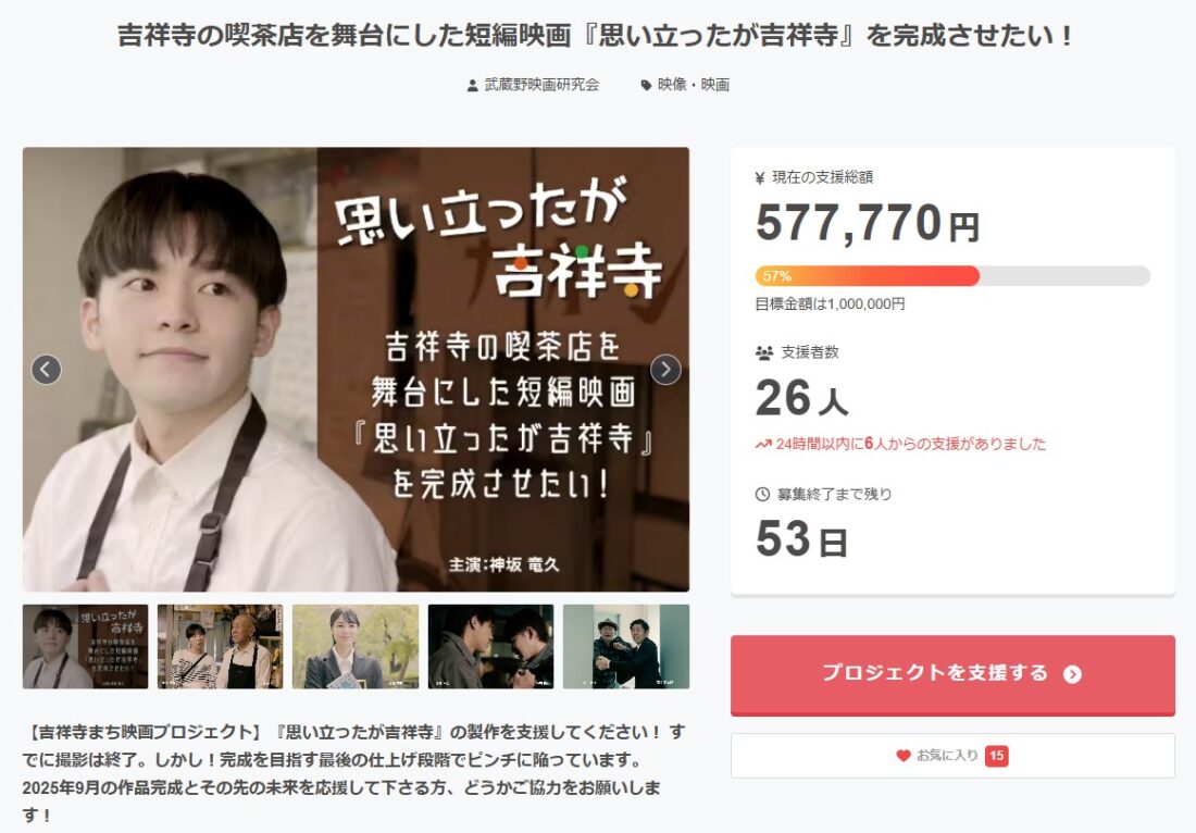 【吉祥寺まち映画プロジェクト】『思い立ったが吉祥寺』の製作を支援してください! すでに撮影は終了。しかし!完成を目指す最後の仕上げ段階でピンチに陥っています。 2025年9月の作品完成とその先の未来を応援して下さる方、どうかご協力をお願いします!