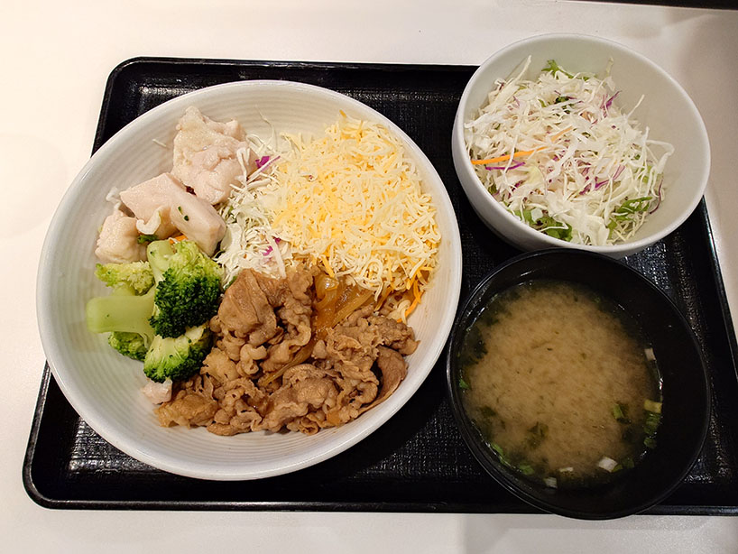 すき家牛丼ライト VS 吉野家のチーズ牛サラダ(どちらも並盛りで対決!)