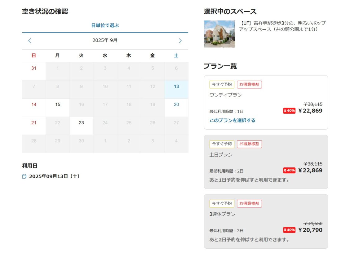 こんな画面になりまして、右側の「空き状況の確認」の部分で、『お得意様割』の適用を確認していただけます。