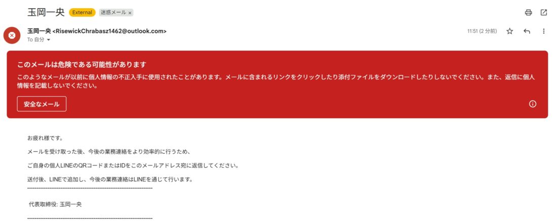 - なりすましの可能性: 送信元のメールアドレスは、本当に会社のドメイン(@company.co.jpなど)ですか? 代表の名前を騙ったフィッシング詐欺や、乗っ取られたアカウントからのメールという可能性も否定できません。