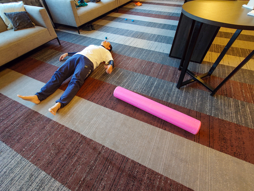 今朝の予報は「雨」でした。起床時にはまだ降っていましたが、少しずつ回復へ向かっている気配でした。出発する5:30になったら、ほとんど降っていない。という状況になりましたが、先週に続き、雨雲レーダーを確認したところ、どうやら6:30には降っているという予報でした。そこで、本日は「吉祥寺エクセルホテル東急」の8Fホワイエに移動して、ストレッチ&交流をすることにしました。さまざまなストレッチ用具を持ち込み、みっちりと練習を行いました。